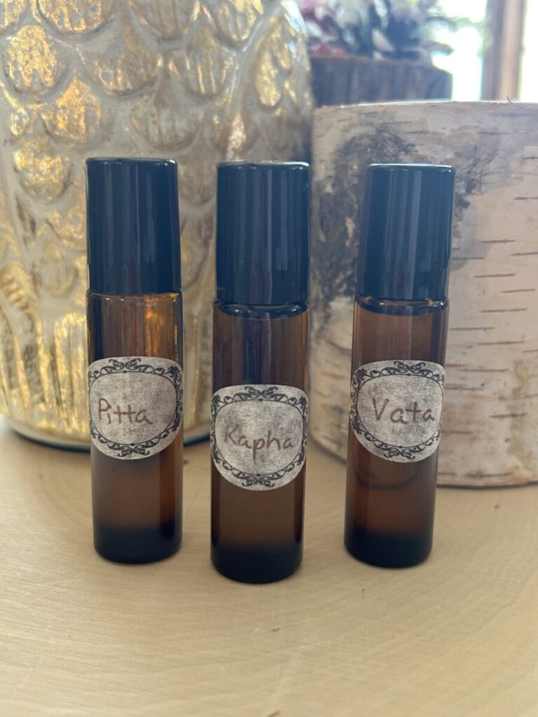 Vata – frankincense and orange, with a floral hint of ylang-ylang (jojoba carrier oil). Warming and grounding.